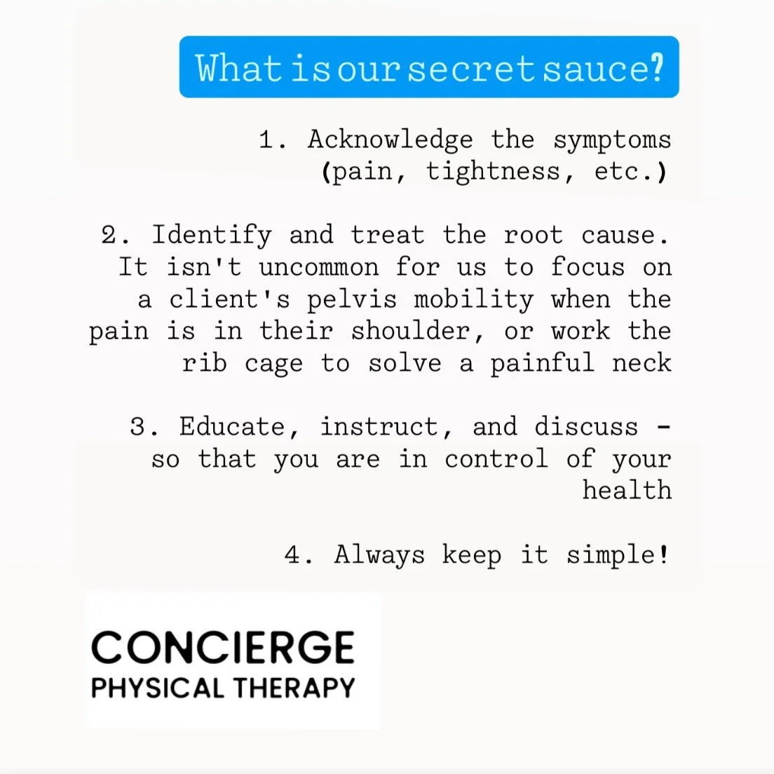 Hands on, one-on-one, effective in 3 visits, educational, and price transparent! See the difference